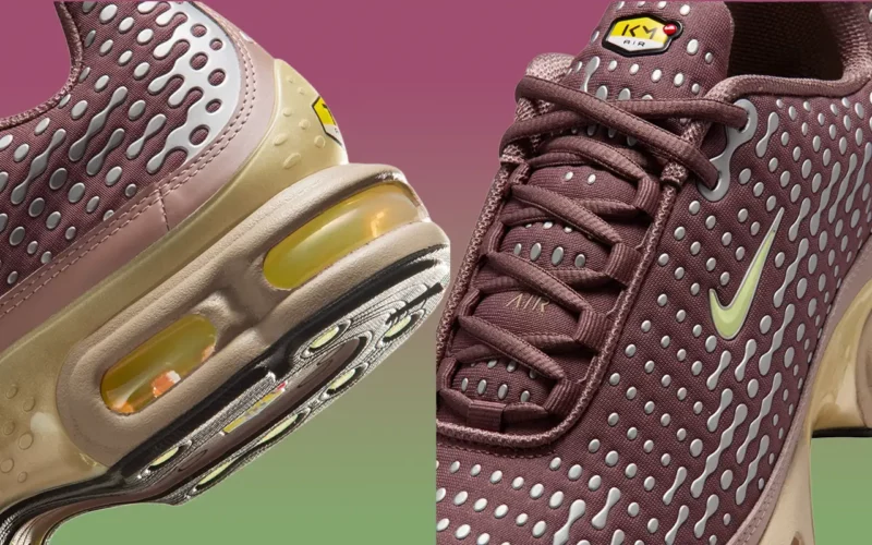 C’est dans les petits détails que cette collab se distingue. Nike a exit le branding « Tuned Air » habituel des Air Max Plus, remplacé par des badges « KM Air« . Côté tige, le mesh prune se pare de micro-imprimés argentés en stippling, qui donnent une silhouette texturée. Ce jeu de contrastes entre les tons terreux et les touches électriques qui propulse la paire vers une énergie avant-gardiste.